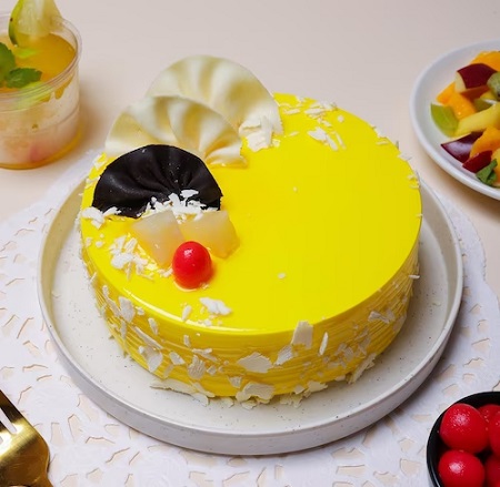 1-Cake Flavour- Pineapple, 2-Type of Cake- Cream, 3-Weight- Half Kg, 4-Shape- Round, Care Instructions, 1-Slice and serve the cake at room temperature and make sure it is not exposed to heat. Use a serrated knife to cut a fondant cake, 2-Sculptural elements and figurines may contain wire supports or toothpicks or wooden skewers for support, 3-Please check the placement of these items before serving to small children, 4-The cake should be consumed within 24 hours, 5-Store cake in a refrigerator